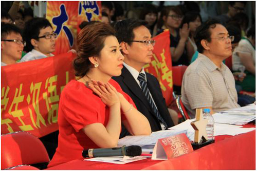 比赛正式开始了,选手们的汉语真不错!三位评委老师聚精会神地观看选手们的精彩表演。看美女主播的认真劲儿!