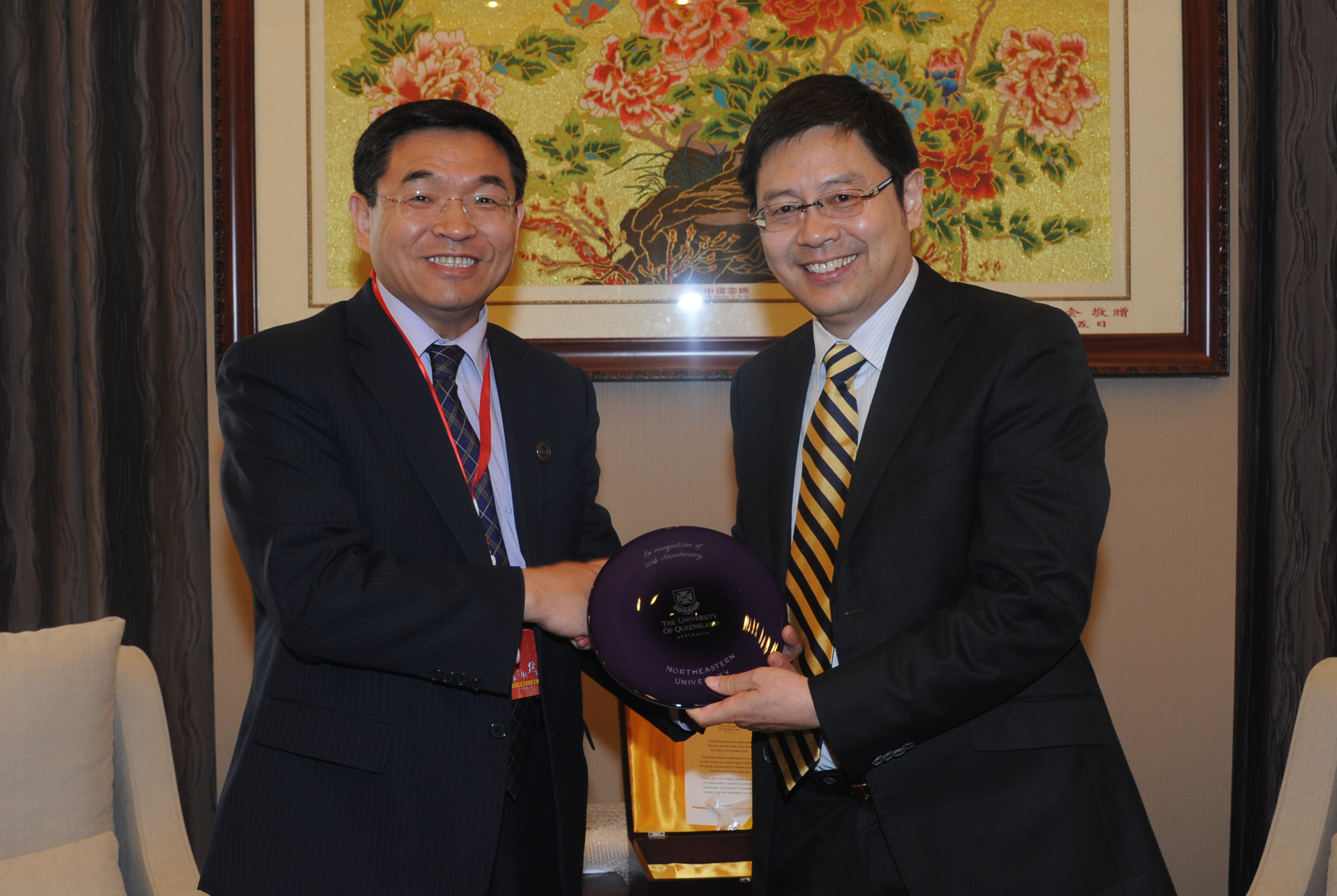 9月15日下午,丁烈云在国际交流中心贵宾厅与逯高清亲切会见。会谈中丁烈云向客人介绍了校庆准备过程,并衷心感谢昆士兰大学应邀参加校庆活动。逯高清再次代表昆士兰大学祝贺东北大学90年华诞,并对昆士兰大学校长Peter Høj教授因身体原因不能如期到访表示遗憾。双方还就加强在生物医学工程、新材料、信息领域的合作进行了商谈并达成初步意向。