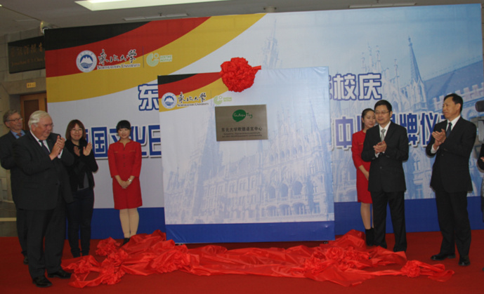 丁烈云在开幕式上致辞,代表东北大学对德国客人表示热烈的欢迎,向长期以来关心、支持学校发展的各位领导和来宾表示衷心的感谢。他希望东北大学同德国高校通过互派教授、合作科研、召开国际学术会议等多种形式进行学术交流与合作,进一步深化双方各领域间的交流与合作。德国驻家。沈阳总领事馆总领事傅培言在致辞中表示,中德两国及两国人民的友谊建立在一个相互理解的良好基础上,共同的语言是互相了解的媒介,傅培言希望,东北大学歌德语言中心的成立能为促进两国人民相互了解和提高同学们的德语水平起到促进作用。教育部合作与交流司司长刘宝利代表教育部国际合作与交流司对东北大学歌德语言中心的成立表示祝贺。刘宝利表示,东北大学歌德语言中心的成立,将为中德文化交流的开展搭建了一个崭新的平台。刘宝利希望中德双方的同事们能通力协作,把东北大学歌德语言中心办好,使之成为德国朋友在沈阳的交流之家。