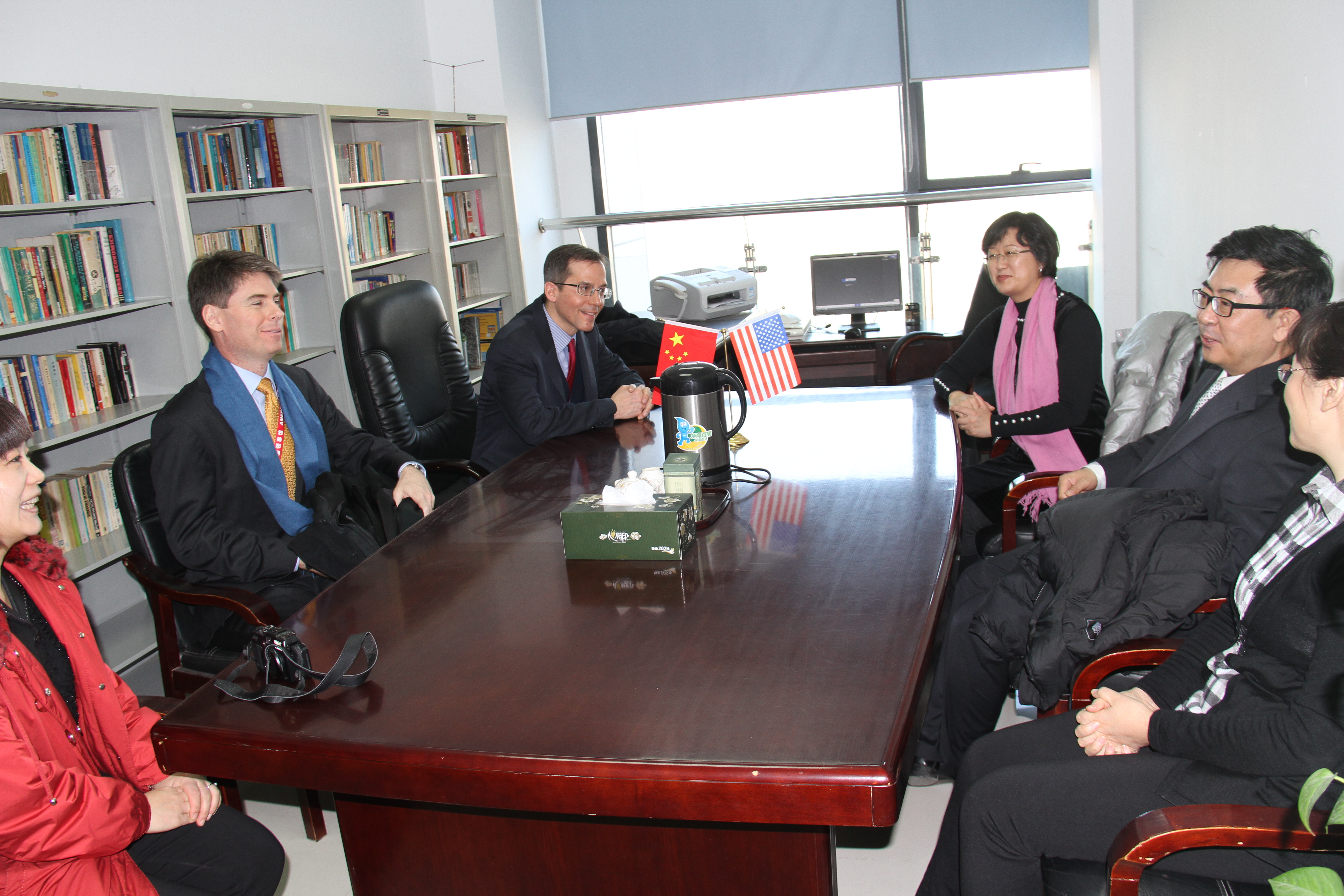 会谈结束后,何志一行在国际合作与交流处处长于福晓及外语学院院长赵雯等相关负责人的陪同下参观了我校的美国文化中心,并就派遣富布莱特学者来我校工作及美国阿巴拉契亚大学教师、学生交换等事宜进行商谈。