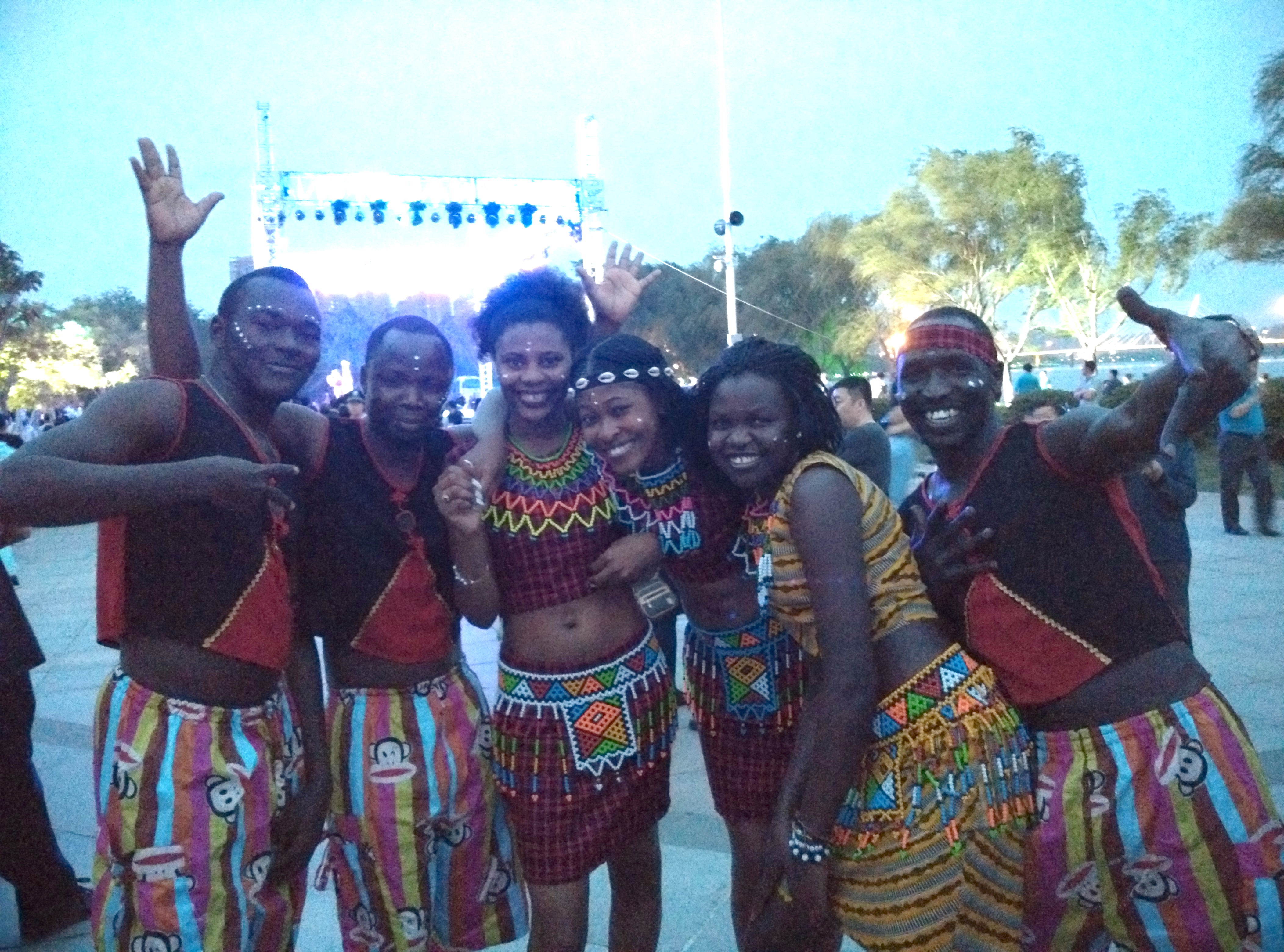 我校非洲留学生安莫夫、珍妮、米可丽娜、瑞根、多多、理查参加了开幕式演出,一支非洲传统舞蹈推高了晚会的气氛,让沈阳市民了解了独特的非洲文化。